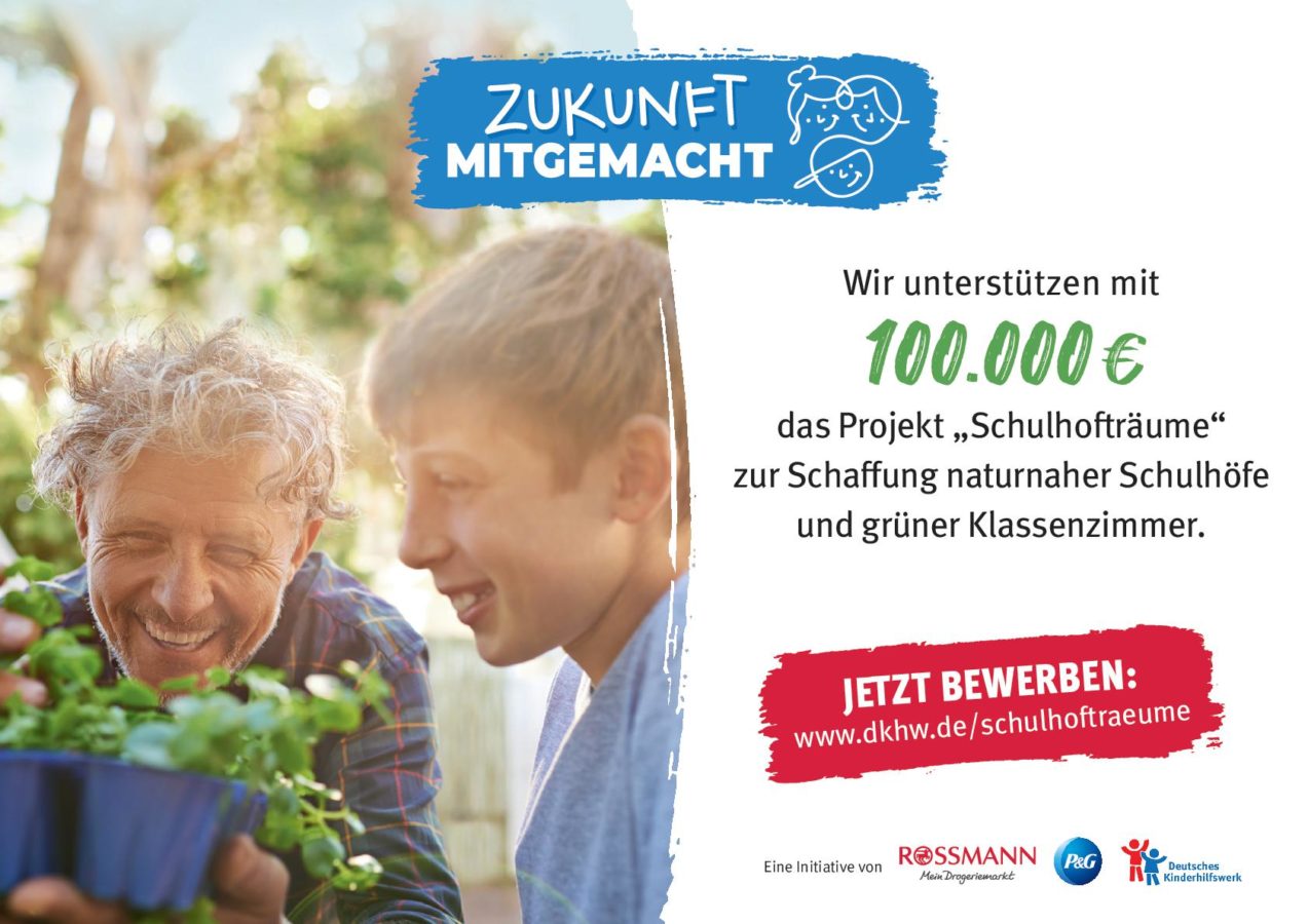 Im Rahmen der Gemeinschaftsaktion des Deutschen Kinderhilfswerks, ROSSMANN und Procter & Gamble wird zum dritten Mal eine nachhaltige und naturnahe Umgestaltung modernisierungsbedürftiger Außenbereiche ermöglicht. Insgesamt fördern die Partner die Sanierung maroder Schulhöfe deutschlandweit mit 100.000 Euro. Diese Summe wird auf 15 Projekte verteilt, wobei die Hauptförderung mit 15.000 Euro dotiert ist. Seit diesem Jahr läuft das gemeinsame Engagement unter dem Dach „Zukunft mitgemacht”. Der Fokus liegt darin, junge Menschen für die Zukunft zu stärken und ihnen die Möglichkeit zu geben, sich über selbstbestimmtes Lernen und Mitgestalten aktiv in die Gesellschaft einzubringen. Mehr Infos unter www.zukunftmitgemacht.de.
